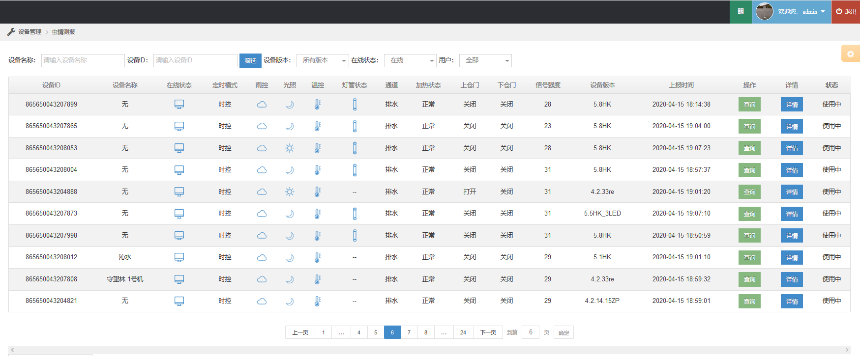 2、可以實時查看設(shè)備的定時模式、光控、雨控、溫控、落蟲、加熱、倉門開啟、信號強度、流量使用情況等工作狀態(tài)信息,能夠準(zhǔn)確的了解設(shè)備的實時的工作情況,可對設(shè)備出現(xiàn)的故障進(jìn)行研判、分析、和預(yù)警。