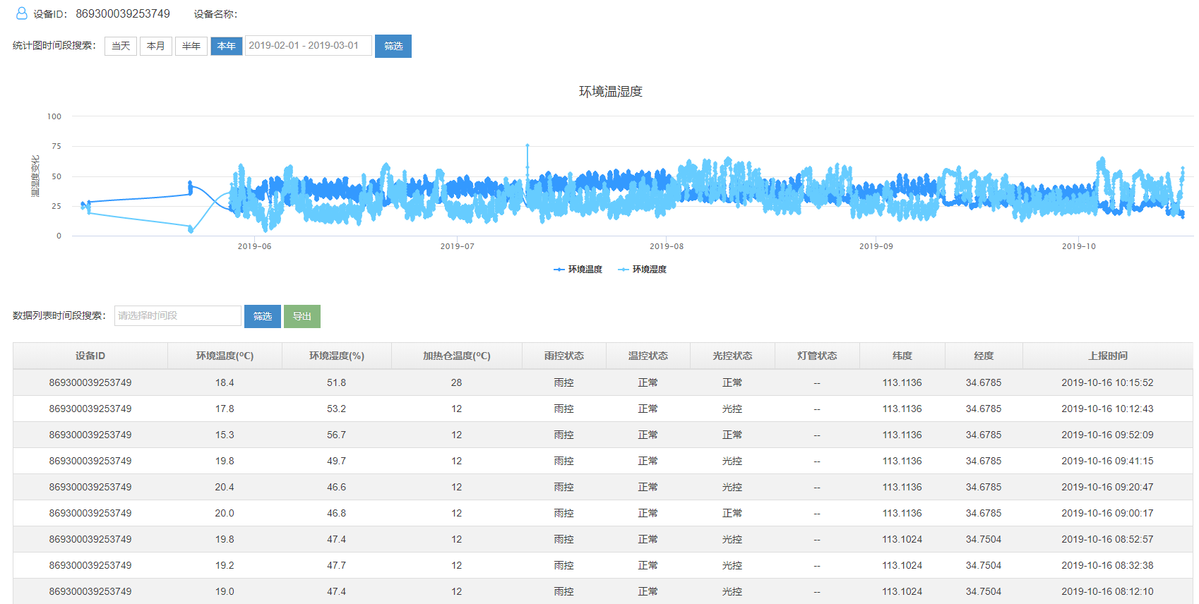 4、設(shè)備可以實時顯示空氣溫度、濕度、加熱倉溫度、雨控、溫控、光控的狀態(tài)、經(jīng)緯度值以及數(shù)據(jù)上報的時間。
