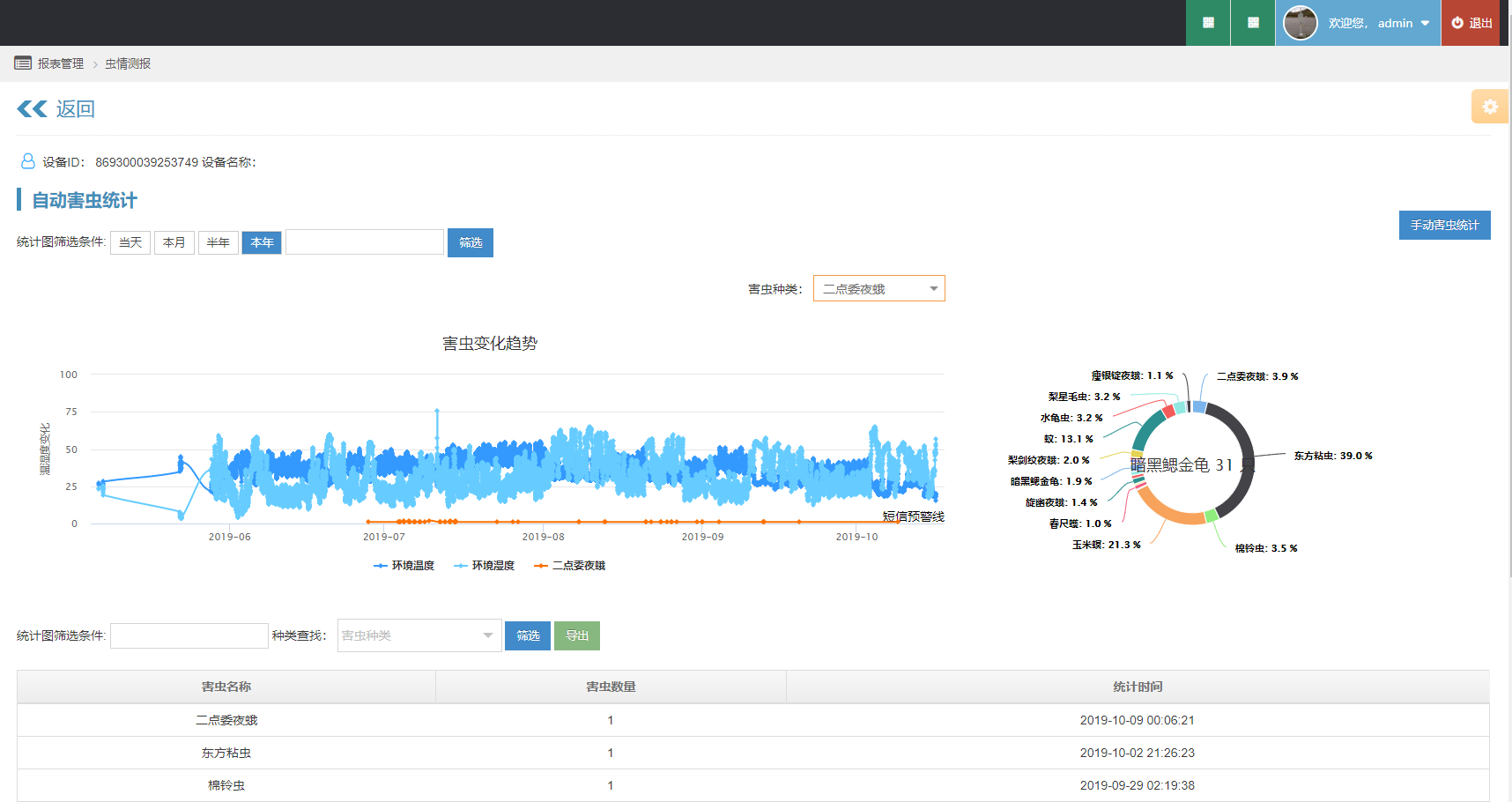 5、可以查看不同時間段采集的害蟲圖片和空氣溫濕度數(shù)據(jù),對采集的害蟲蟲類、數(shù)量、大小、生長周期等進(jìn)行自動識別,以圖表和折線圖的形式展現(xiàn)給客戶,蟲體報表可以自行導(dǎo)出方便客戶使用。能夠?qū)οx害通過氣象和蟲體種類、數(shù)量報表合并展示,直觀的進(jìn)行分析蟲體的發(fā)生規(guī)律,方便用戶結(jié)合害蟲的發(fā)生情況,更加準(zhǔn)確的對蟲害的發(fā)生進(jìn)行趨勢進(jìn)行分析和預(yù)警。害蟲統(tǒng)計報表可以一鍵導(dǎo)出,轉(zhuǎn)化成各種格式,方便用戶統(tǒng)計分析。
